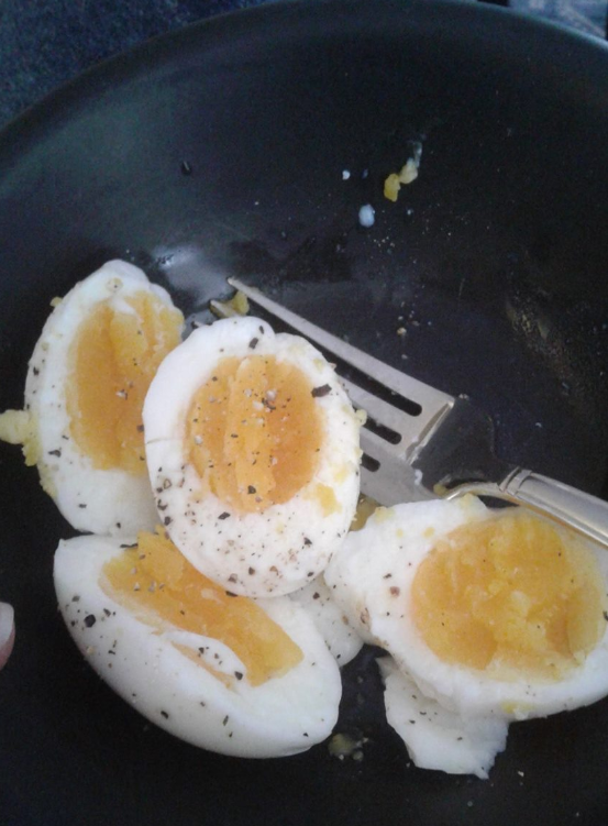 I have a weird relationship with eggs. They're fine in things, but I have to really be in the right mood to eat fried eggs. They're an easy way to get a ton of nutrients so at various points of my eating disorder, I've become so picky from getting great fresh eggs that for a while I was drinking raw eggs every morning. Apparently I can stand them boiled, and I've been working on my timed eggs and cool water shock. A few months ago I made some absolutely terrible stuffed eggs that had lots of eggshells, so I've been doing my homework. I present, perfectly soft 8-minute eggs.