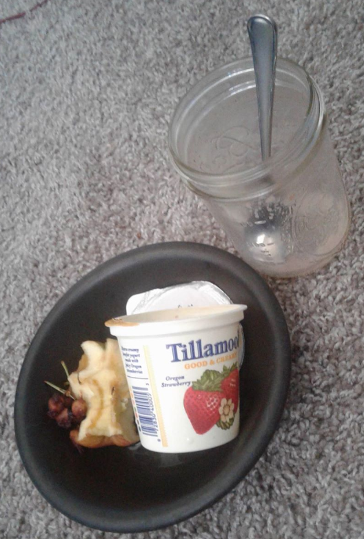 I struggle to finish my food and I ate a whole solid breakfast. Pic is of an empty glass that had a chocolate protein shake in it, a bowl with an apple core and cherry pits and stems, and an empty yogurt cup. Nothing is left of the blueberries.
