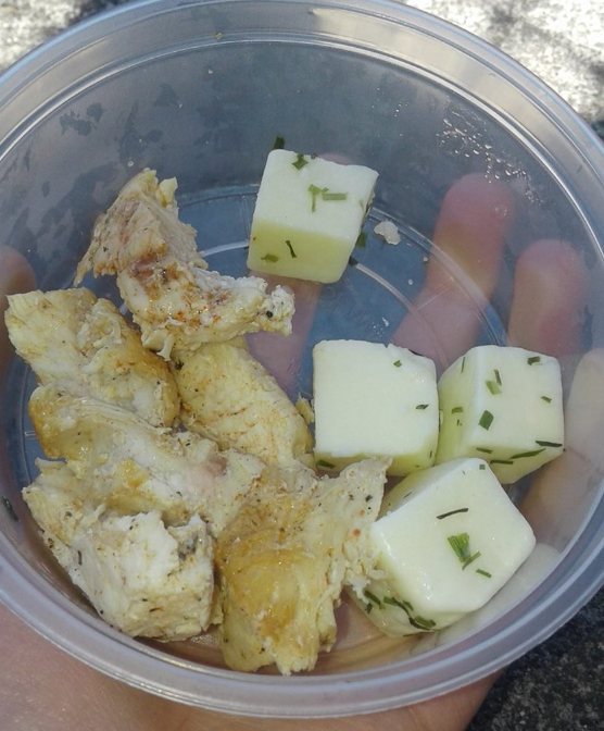 Stoked that I finally got to go to the local farmer's market where they take food stamps, featuring garlic chive cheddar cheese curds. The chicken is some extra I made last night for a Caesar salad. It's super tender because I used a rolling pin to flatten it.
