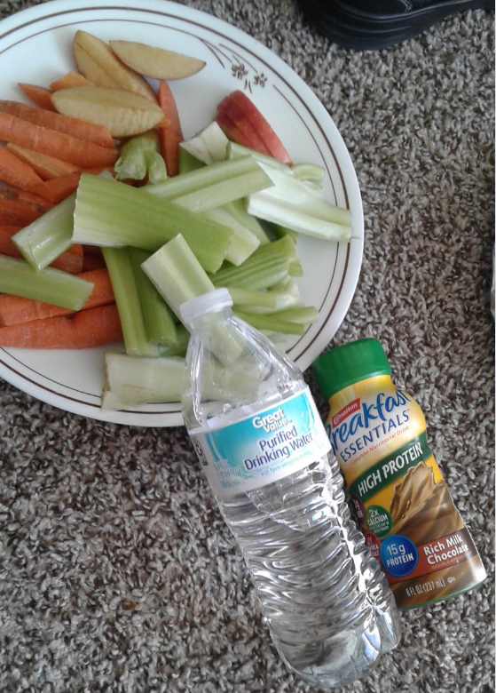 Image description is of a plate of vegetables and fruit, a water bottle, and a protein drink. This depression meal is lying on carpet because it is next to the couch where I am munching and writing. I confess, it's not my proudest work. I basically just grabbed all this from the fridge after having a cigarette. The veggies were chopped a few days ago, when I had some extra energy.