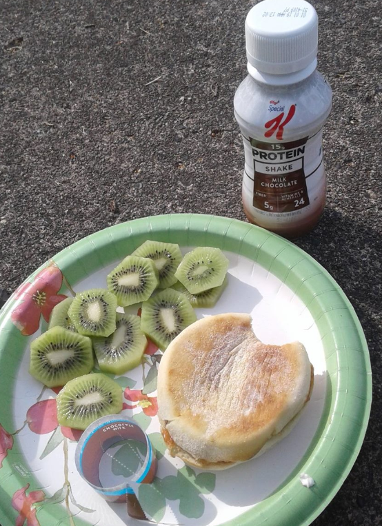 This is all I can stomach of what would be enough to get me through a looong morning. Image is of a protein drink, English muffin, and sliced kiwis. But no, my new med insists I'm too sick despite also taking Zofran and smoking a bowl. Fml