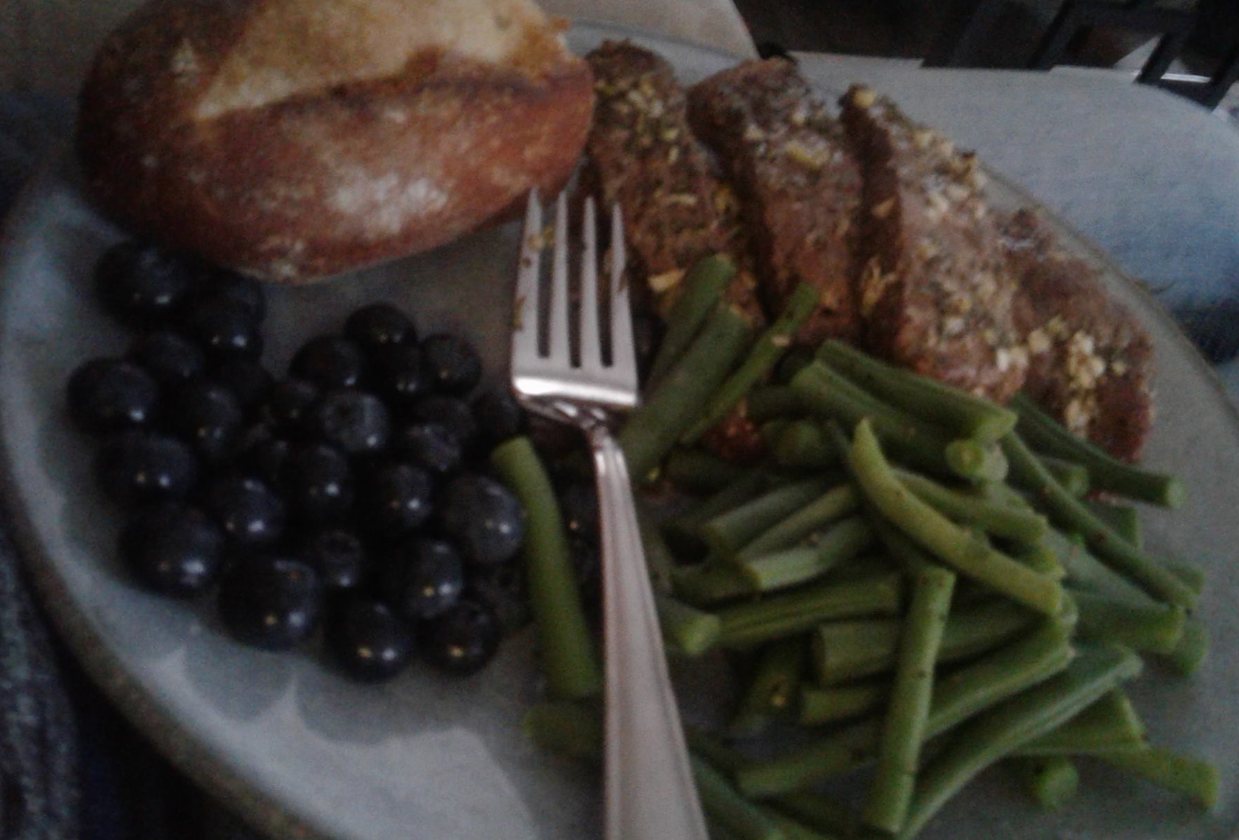 The image below is of a recent lunch which looks extravagant but is mostly food bank food, I just beat the shit out of an old steak and broiled it like lamb chops (haven't had lamb in years), steamed some green beans, tore off the slightly moldy end of hard bread, and helped myself to some blueberries my roommate picked to share.