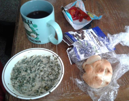 Depression day, aka what's pictured: dollar store candy, a leftover sweet roll I made a couple of days ago, a bowl of spinach havarti dip (all I had was havarti don't judge) from last night, and a cup of raspberry tea. Yes, that is Snorlax on the mug.