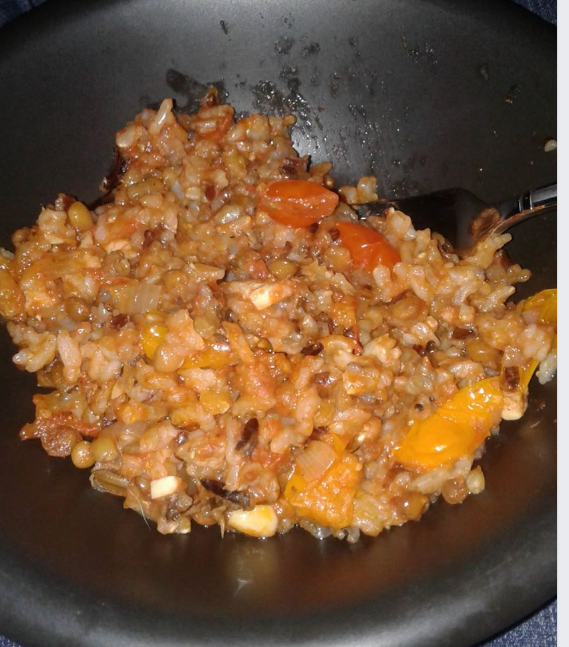 I listened to the audio book "Letter to my Daughter" by Maya Angelou over the past few days. She said red rice was her favorite food, and the description of it made me want to try. I used chicken instead of bacon and used a wild-rice lentil mix as the base, which took forever to cook well enough, but four hours later it tastes fucking amazing. But I 100% know it's nothing compared to how it would be made by someone who grew up with a family recipe for it.