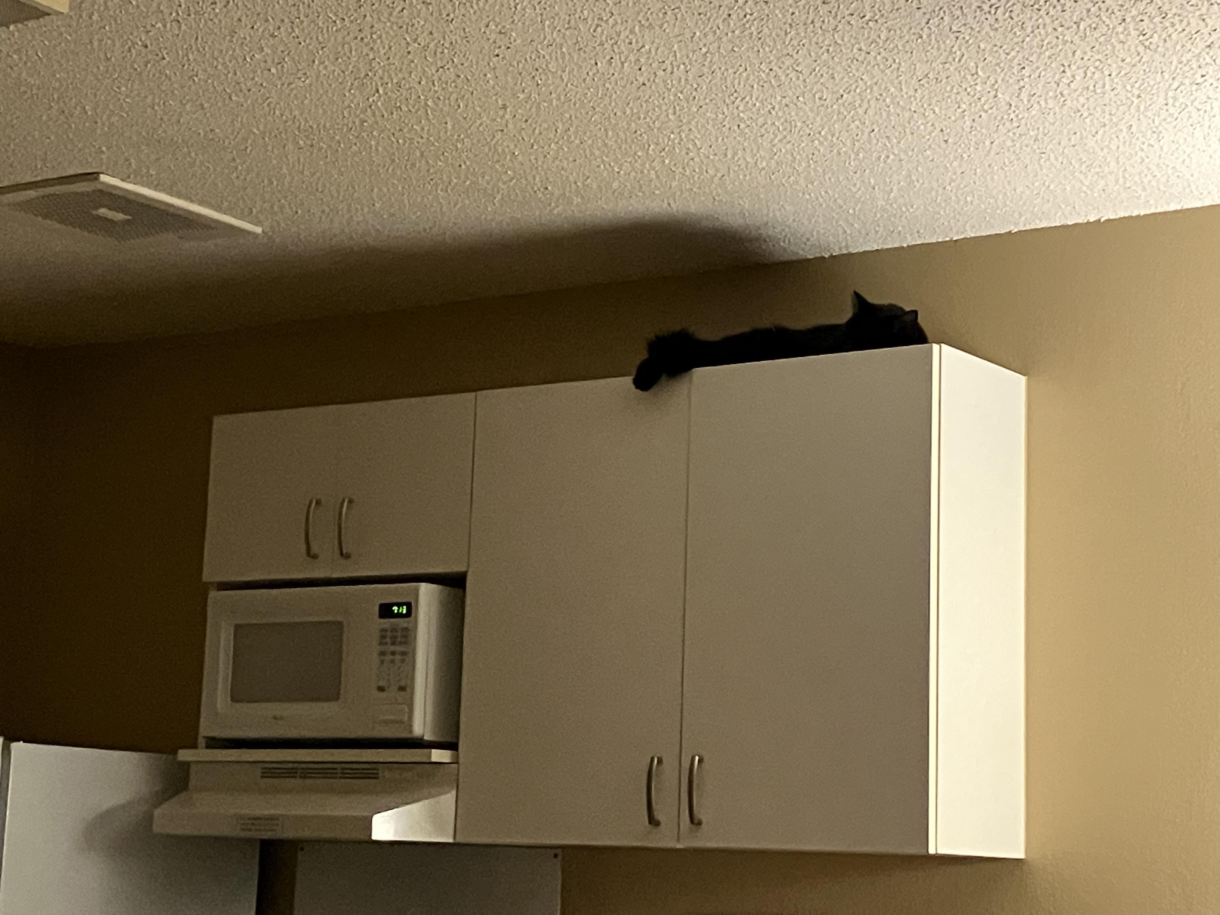 The cats had different reactions to moving into a hotel room. Tilda hid for days. Belladonna didn't want to leave her carrier at first. Once they settled in, they chose favorite spots. They both like to hide behind the curtains in the big windowsill. They like the vantage point on top of the cupboards, too.