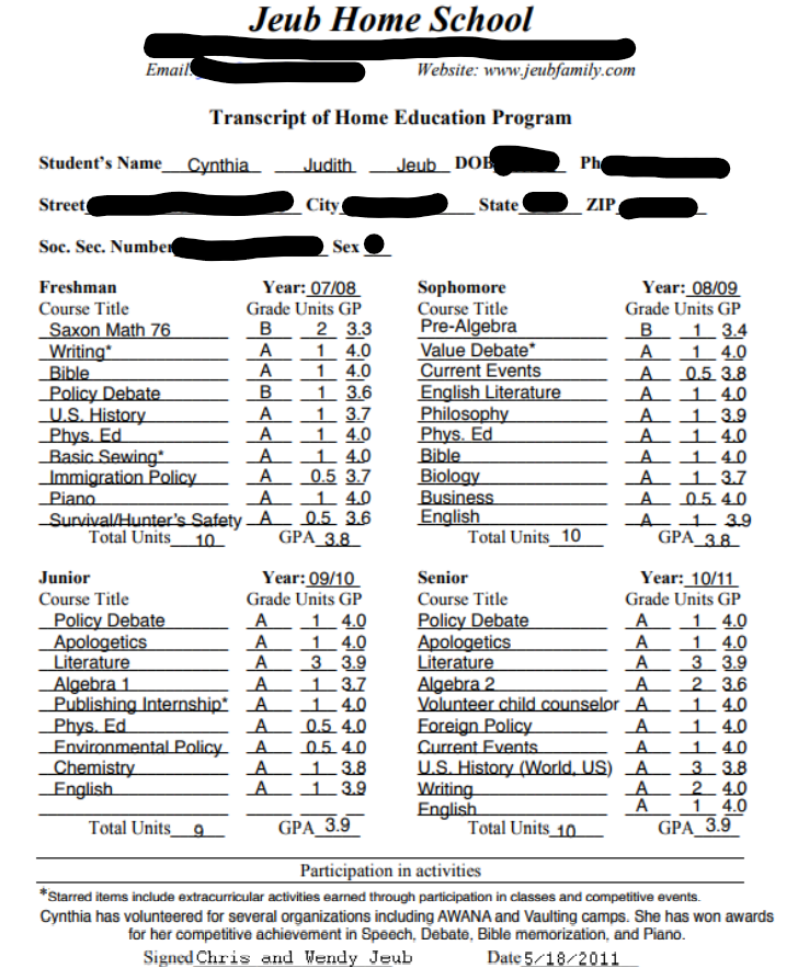 Below is the actual high school transcript that I designed and wrote myself based on a template I found on Google, and asked my parents to sign. The first thing to note is that I had never been graded on anything, and knew only that I needed to be realistic while getting as close to a 4.0 score as possible. When I presented it to my dad, he asked why I hadn’t put down 4.0 in everything, and I said it didn’t seem realistic to me. I knew I hadn’t taught myself math very well, though I’d tried to work my way to the answers on my own. Every grade is not even a guess, but a blatant lie, because I never had grades. I just needed to write something that looked like I had.