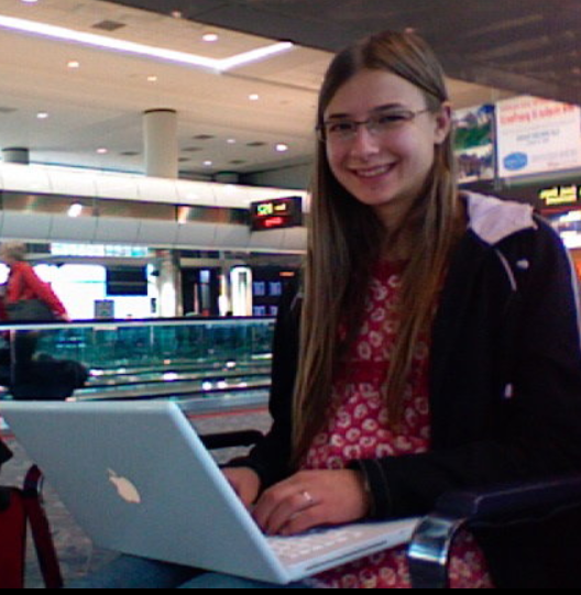 Image description: In this picture I’m in an airport under blurry gate numbers, typing away at my laptop. My long brown hair is pulled behind my ear, I’m wearing rectangular glasses with metal frames, and I’m smiling at the camera.