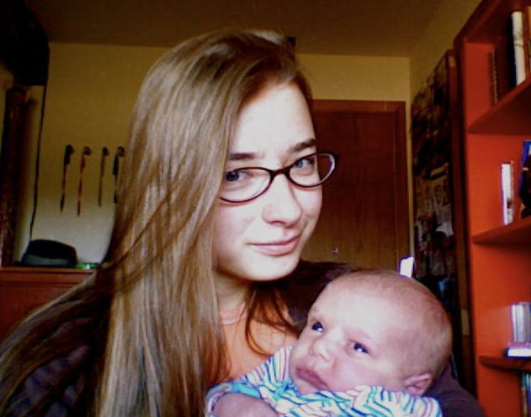 Image description: I’m sitting at a desk in my bedroom, with a bookshelf and a row of speech and debate ribbons along the walls behind me. I’m holding a very young newborn baby with wide blue eyes. I’m wearing oval plastic-rimmed glasses and I’m smiling sidewise at the camera.