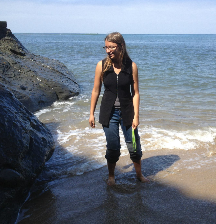 Image is of blue-gray rocky shores surrounding me, standing at the shallow edge of the ocean, waves gently washing over my bare feet. I’m looking off to the side and smiling weakly. I’m wearing that same black vest, this time with a gray shirt under it, and rolled-up jeans.
