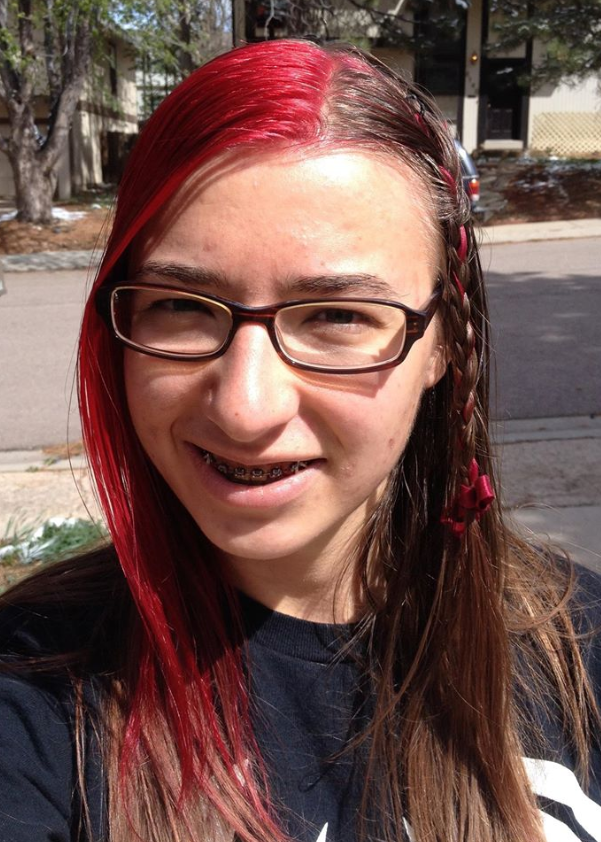 In this image my brown hair is dyed red in the front right side, and on the other side I’ve braided a red ribbon into part of my hair. My glasses are rectangular and plastic now, and I’m wearing braces, which I got so late in life because they were part of a charity and required community service from me.
