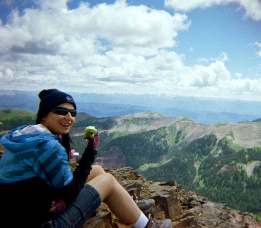 This image is of me atop a mountain, eating a green apple to make me look like an asshole, with rows of mountains stretching out below me. I’m dressed in a beanie, sunglasses, a blue windbreaker, jean shorts, and climbing boots.