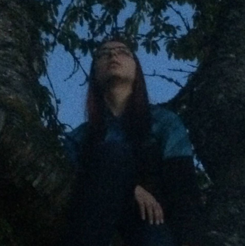2016. I don’t have very many pictures of myself from this point on because there hasn’t been much to photograph – living in a car or in a basement doesn’t make for great photography, and that’s how the next few years were. 2016 was the beginning of my current relationship, and my partner and I had a few parks we loved to frequent, and this one was taken of me in the top of a tree at dusk. The lighting is dim, but the tree branches look black against a soft blue sky, and I’m looking up whimsically, my long hair appearing dark over a blue jacket, the rims of my glasses barely visible.