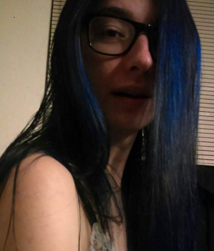 Image description: A photo of me in low light in front of a plain wall and off-white window blinds. I'm wearing plastic rimmed glasses and a sleeveless pajama top, and looking over my shoulder into the camera. My hair is dark blue, and looks almost black in this light. It is pulled over my left eye for an emo appearance, but mainly that's to cover the blue spot of dye that lingers on my forehead.