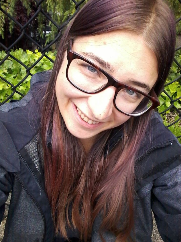 Image is of me with my head tilted to my left, smiling and looking up at the camera. I'm wearing wide plastic rimmed glasses, my hair is long and brown with hints of purple and red, and I've got a big grey coat on. Behind me is a wire fence and some green trees beyond it.