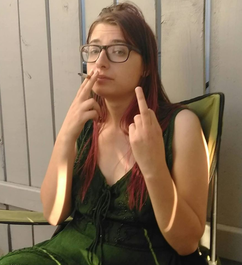 Bonus picture from my birthday on 2018. Image is of me, wearing a low-cut emerald dress, my messy brown hair hanging loose with hints of my last color - dark red and purple. With my right hand, I'm finishing a cigarette, and with my left, I'm flipping off the camera. I have a smug, unimpressed look on my face, traces of smudged mascara, and dirty plastic-rimmed glasses. I'm sitting on a lawn chair in front of a white fence.