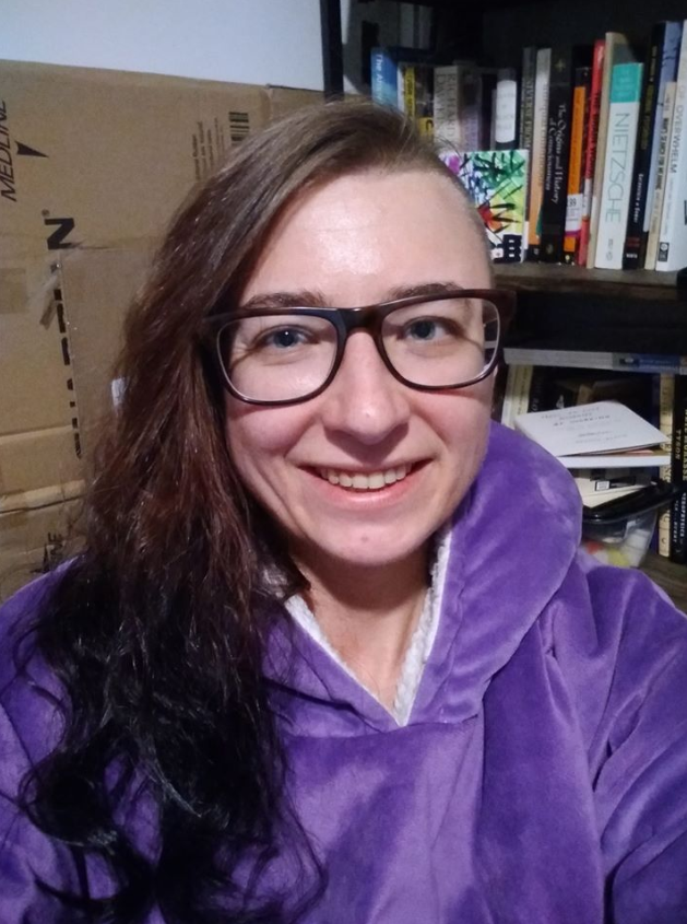 Image is of me in front of a bookshelf full of books and some folded cardboard boxes. I'm wearing big plastic rimmed glasses and am smiling widely at the camera in selfie fashion, and my long hair is all brushed to the right with the left side of my head shaved, naturally brown on top and colored black starting halfway down to the bottom, partially curled at the ends. I'm wearing a big soft purple blanket hoodie.