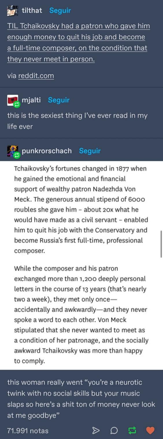 TIL Tchaikovsky had a patron who gave him enough money to quit his job and become a full-time composer, on the condition that they never meet in person.